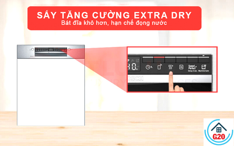 Để có kết quả rửa hoàn hảo, máy rửa bát Bosch trang bị chức năng ExtraDry – sấy tăng cường. Với ExtraDry, lượng nhiệt bổ sung được giải phóng để kéo dài chu trình sấy khô, đảm bảo mọi vật dụng kể cả đồ nhựa cũng được khô ráo trước khi bạn lấy ra xếp lên tủ bếp. An toàn, vệ sinh và sạch vi khuẩn.