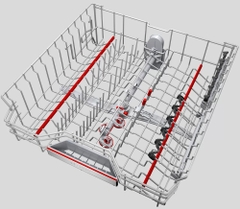 Xếp chén bát vào máy rửa bát đúng cách có thể là một thách thức. Với giỏ Max Flex thì không như vậy. Giỏ dưới ổn định và các hàng gai có thể gập lại, cho phép đặt các vật dụng lớn bằng sành sứ. Giá đỡ ly được thiết kế mới với dải chống trượt làm bằng silicone trong giỏ phía trên đảm bảo rằng ly của bạn được xếp gọn gàng. Ngăn trên cùng có một ngăn đựng dao kéo. Giỏ Max Flex đảm bảo sự linh hoạt hoàn toàn và tải ổn định cho máy rửa bát của bạn.