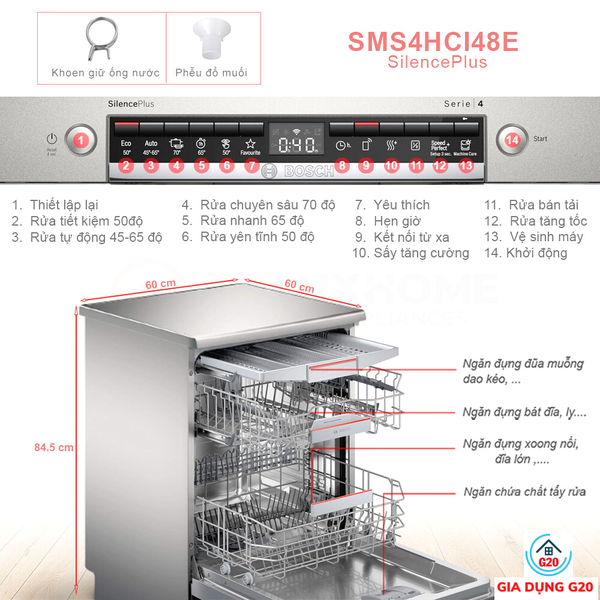 - Chức năng đặc biệt (4 tính năng đặc biệt) Home Connect, tăng tốc, rửa bán tải, sấy thêm