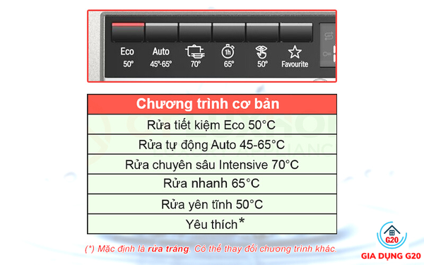 - Số chương trình rửa: 6 chương trình rửa: rửa mạnh 70°C, Tự động 45-65°C, Tiết kiệm 50°C, Yên lặng 50°C, 1h 65ºC, Yêu thích (rửa tráng)