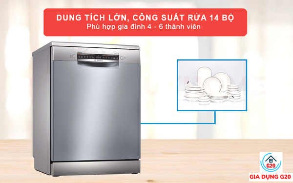 Máy rửa bát Bosch SMS4HCI48E serie 4 có khả năng rửa 14 bộ đồ ăn. Với dung tích lớn nó có thể phục vụ lượng bát đĩa của một gia đình 4-6 người. Công suất rửa 14 bộ đồ ăn châu Âu cũng tương đương 3 - 4 bữa ăn Việt.