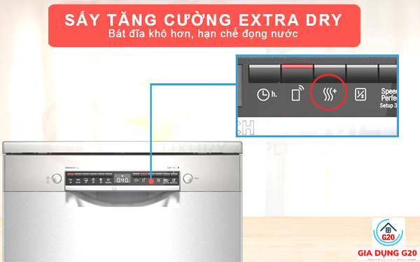 Tính năng Extra Dry hơn hẳn các tính năng sấy cơ bản khác nhờ cơ chế riêng biệt. Sau khi kích hoạt Extra Dry cùng với chương trình rửa cơ bản, vào cuối chương trình rửa, Extra Dry sẽ giúp tăng nhiệt ở lần tráng cuối cùng. Vì nhiệt độ cao mà các phân tử nước sẽ vào trạng thái bay hơi sau đó ngưng tụ tại khay dưới cùng.