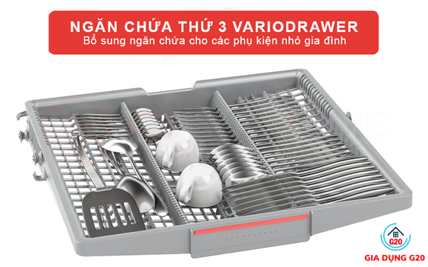 Giàn rửa trên cùng Vario Drawer là giải pháp tăng thêm không gian chứa đồ trong máy rửa bát Bosch SMS4HCI48E serie 4. Nó phù hợp để đựng các đồ dùng nhỏ như thìa, đũa, nĩa.... Và có thể còn là các tách trà nhỏ…