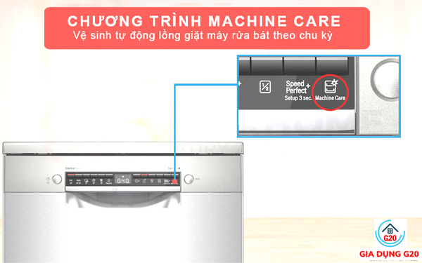 Máy rửa bát Bosch SMS4HCI48E có tính năng Machine Care - vệ sinh máy tự động. Bạn chỉ cần nhấn nút Machine Care trên bảng điều khiển hoặc ứng dụng Home Connect. Máy sẽ nhận tín hiệu và thực hiện rửa full tải ở nhiệt độ cao. Nhờ vậy khoang máy gần như sẽ được tiệt trùng vì nhiệt độ nước có thể diệt sạch vi khuẩn. Điều đó giúp những lần rửa tiếp theo đạt được hiệu quả như mong đợi.