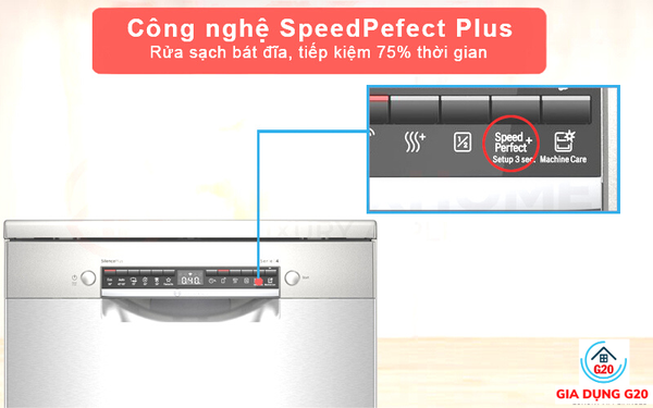 Tăng tốc chính là ưu điểm của tính năng SpeedPerfect Plus trên dòng máy rửa bát Bosch SMS4HCI48E serie 4. Nó giúp giảm đáng kể thời gian rửa của một chương trình thường đến 75%. Giờ đây bạn có thể tận dụng tính năng này trong một số trường hợp. Chẳng hạn như cần rửa gấp để sử dụng bát đĩa ngay.