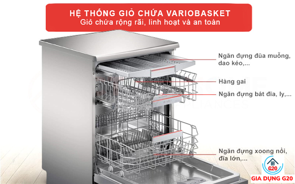 Giỏ chứa Variobasket là một hệ thống các giỏ có thiết kế sâu và chắc chắn. Với hàng gai phía ngoài, nó giúp cố định bát đĩa trong giỏ. Tránh tình trạng xô lệch và rơi vỡ. Điều đó giúp người dùng an tâm và thoải mái khi xếp đồ dùng vào giỏ, ngay cả những đồ dễ vỡ.