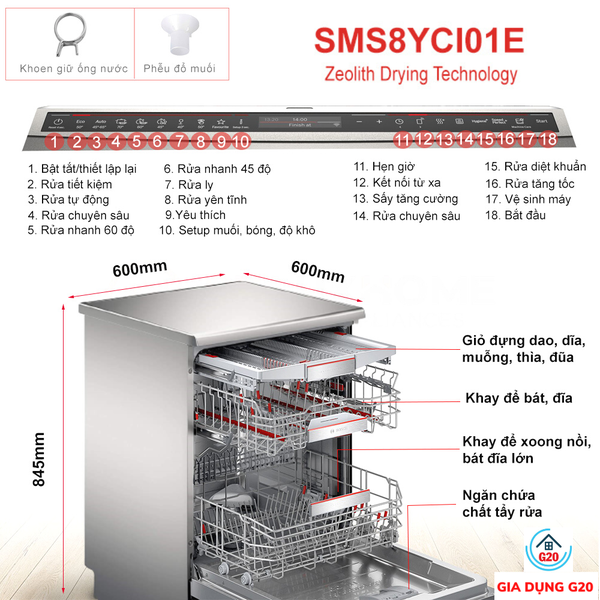 Thông số kỹ thuật của Máy Rửa Bát Bosch SMS8YCI01E Serie 8 – Độc Lập