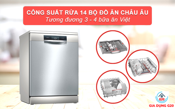 Máy rửa bát cao cấp Bosch SMS8YCI01E có dung tích một lần rửa tối đa lên đến 14 bộ đồ ăn châu Âu, tương đương với số lượng chén đĩa trong 3 - 4 bữa ăn Việt. Công suất rửa này của máy Bosch model SMS8YCI01E đủ đáp ứng nhu cầu sử dụng cho gia đình từ 4 - 6 người mà chỉ cần rửa mỗi ngày 1 lần.