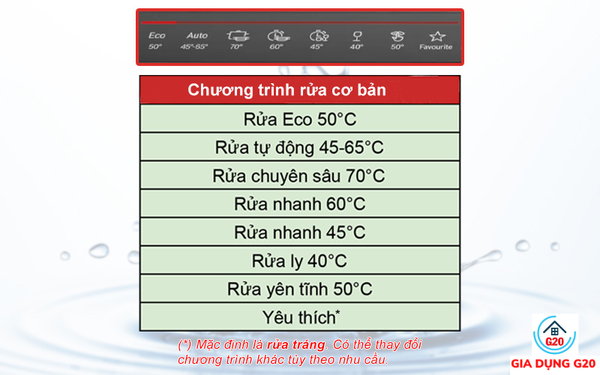 - Số chương trình rửa (8 chương trình rửa): Rửa mạnh 70°C, Tự động 45 - 65°C, Tiết kiệm 50°C, Yên lặng 50°C, 1.5h 60ºC, Thủy tinh 40°C, Rửa nhanh 45°C, Yêu thích (rửa tráng)