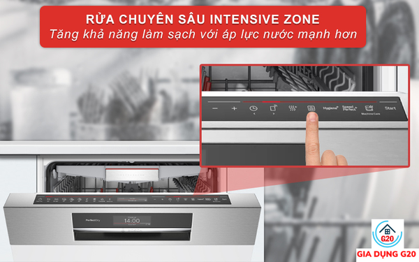 Tính năng rửa chuyên sâu giàn dưới cùng IntensiveZone với dòng nước mạnh và nhiệt độ cao giúp đánh bay những vết dầu mỡ cứng đầu bám trên bát đĩa hoặc nồi chảo so với các chương trình rửa cơ bản khác. Đây là tính năng đặc biệt dành riêng để rửa sạch đồ dùng nhiều cặn bẩn ở giàn dưới cùng.