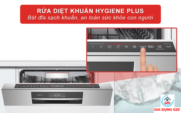 Với tính năng Hygiene Plus rửa diệt khuẩn, máy rửa bát Bosch SMS8YCI01E sẽ thay người dùng thực hiện việc này. Tính năng này tăng nhiệt độ nước rửa lên mức 70ºC trong vòng 10 phút. Với mức nhiệt độ này, đa phần vi khuẩn và nấm mốc đều sẽ bị tiêu diệt. Người dùng có thể kết hợp tính năng rửa diệt khuẩn Hygiene Plus với các chương trình rửa cơ bản khác để tối ưu hiệu quả làm sạch và bảo vệ sức khoẻ.