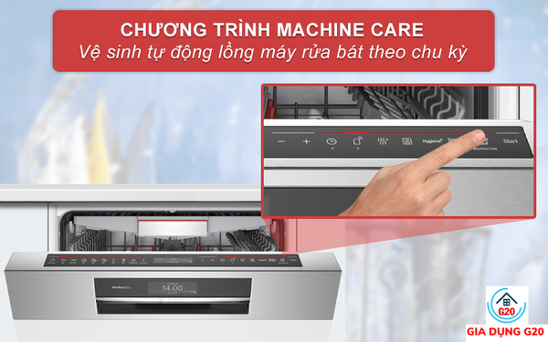 Chương trình vệ sinh máy rửa bát Machine Care là chương trình cho phép máy tự động làm sạch buồng rửa mà không cần người dùng động tay vào. Khi kích hoạt, tính năng này sẽ thực hiện một quá trình rửa full tải với nhiệt độ cao giúp làm sạch khoang chứa. Khi chạy Machine Care, cần để máy rửa bát chạy không tải và kết hợp với chất vệ sinh máy đặc biệt. Thời gian chạy chương trình là 135 phút. Ngoài ra, sau 30 chu kỳ rửa, tính năng này cũng sẽ nhắc người dùng về vệ sinh máy.