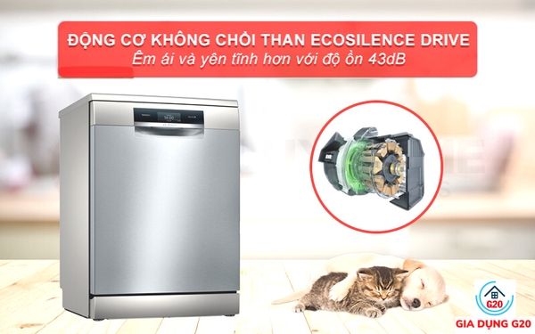 Máy rửa bát Bosch SMS8YCI01E vận hành với độ ồn chỉ ở mức 43dB và chỉ 41dB ở chương trình rửa yên tĩnh. Mức độ ồn này tương đương với tiếng lá xào xạc hoặc tiếng nói thì thầm, không ảnh hưởng đến môi trường xung quanh. Điều này có được là nhờ động cơ không chổi than EcoSilence Drive giúp máy hoạt động mạnh mẽ mà không gây ra quá nhiều tiếng động.