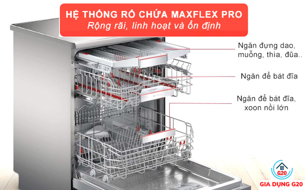 Hệ thống rổ chứa MaxFlex cho không gian bố trí đồ dùng rộng rãi hơn nhờ thiết kế giỏ chứa sâu hơn. Điều này giúp người dùng có thể sắp xếp các vật dụng lớn vào rổ chứa mà không bị cấn. Rổ chứa ở giữa và dưới cùng được làm chắc chắn. Các hàng gai được bọc đệm silicon để không làm xước bề mặt vật dụng có thể mở ra để xếp ly, hoặc gập lại để tạo khoảng trống để xoong nồi.