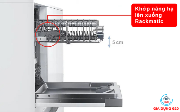 Với hệ thống Rackmatic, người dùng có thể dễ dàng điều chỉnh độ cao của giàn rửa theo nhu cầu thông qua các khớp nối trên giàn. Người dùng cũng có thể điều chỉnh độ cao giỏ chứa ngay cả khi đang đầy. Với hệ thống này, không gian mỗi giàn rửa được kéo cao hơn để tạo khoảng trống chứa vật dụng lớn.