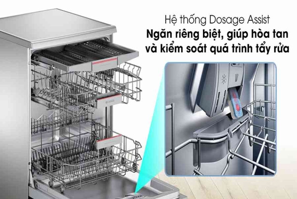 Hệ thống hỗ trợ phân phối chất tẩy rửa Dosage Assistant được tích hợp để tối đa hiệu quả rửa của máy khi sử dụng chất tẩy rửa dạng viên. Sau khi cho viên rửa bát vào ngăn chứa và chạy máy, viên rửa sẽ rơi xuống khoang đặc biệt ở giàn rửa thứ 2. Tại đây, viên rửa sẽ được hòa tan với nước theo kiểm soát và được phân bổ đồng đều khắp khoang rửa nhờ hệ thống Dosage Assistant. Nhờ đó, bát đĩa được làm sạch tối ưu; vừa đảm bảo tiết kiệm chất tẩy rửa, vừa loại bỏ tình trạng không bị quá nhờn hoặc rửa không sạch.