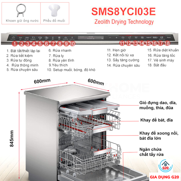 - Chức năng đặc biệt: Home Connect, tăng tốc, vùng rửa mạnh, sấy thêm, diệt khuẩn
