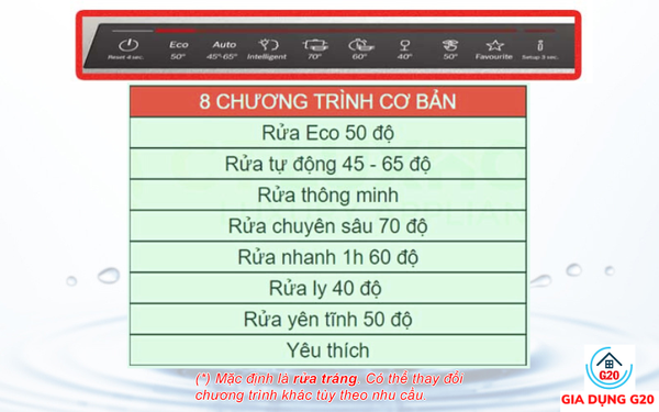 - Số chương trình rửa ( 8 chương trình rửa): Rửa mạnh 70°C, Tự động 45-65°C, Tiết kiệm 50°C, Yên lặng 50°C, 1.5h 60ºC, Thủy tinh 40°C, Rửa nhanh 45°C, Yêu thích (rửa tráng)