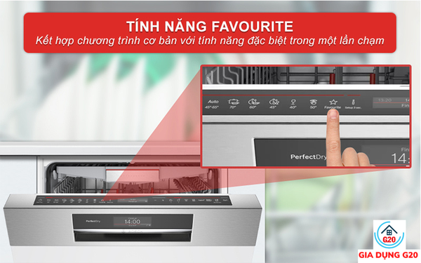 Chương trình Favourite cho phép người dùng có thể cài đặt kết hợp 1 chương trình cơ bản và tính năng bổ sung chỉ bằng 1 nút ấn. Nhưng khi không cài đặt gì cả thì chương trình yêu thích được mặc định là chương trình rửa tráng 15 phút.