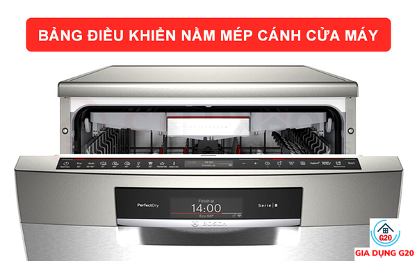 Bảng điều khiển chính của máy rửa bát Bosch model SMS8YCI03E ứng dụng công nghệ cảm ứng TouchControl được bố trí ở phần mép trên của cánh cửa máy.