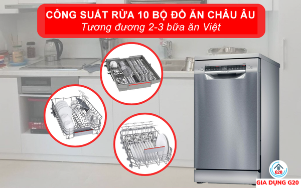 Với bề ngang máy chỉ 45cm, máy rửa chén Bosch SPS4EMI60E có thể rửa tối đa 10 bộ đồ ăn châu Âu. Công suất rửa này tương đương 2 - 3 bữa ăn Việt phục vụ cho gia đình 3 - 4 người.