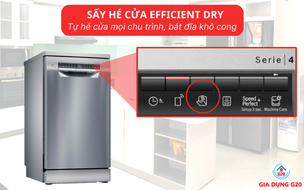 Tuy nhiên, Bosch đã có sự cải tiến khi áp dụng công nghệ Efficient Dry lên mẫu máy rửa bát đời mới SPS4EMI60E. Đây là công nghệ sấy hiệu quả kết hợp hé cửa giúp bát đĩa khô tự nhiên, không còn hiện tượng tái ngưng tụ. Đặc biệt, Efficient Dry có thể sấy hé cửa ở mọi chương trình và không tiêu tốn điện năng.