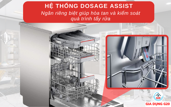 Nhờ hệ thống Dosage Assistant mà bát đĩa được làm sạch tối ưu và hiệu quả hơn, không còn hiện tượng nhớt sau khi rửa.
