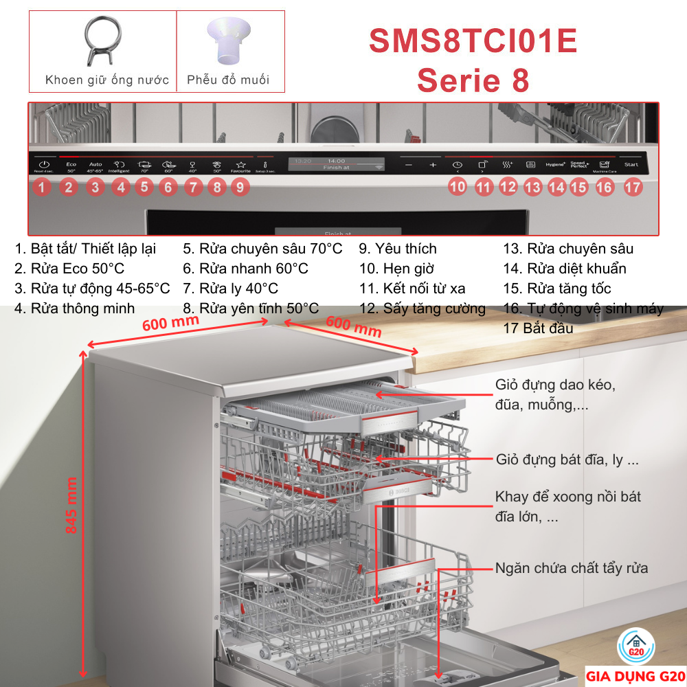 THÔNG SỐ KỸ THUẬT MÁY RỬA BÁT ĐỘC LẬP BOSCH SMS8TCI01E SERIE 8 SẤY ZEOLITH