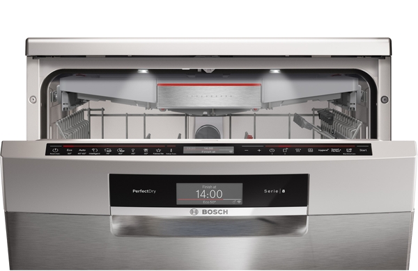 Máy rửa chén Bosch SMS8TCI01E được trang bị với bảng điều khiển hiện đại nằm ẩn ở bên trong. Đi cùng 2 màn hình LED hiển thị cho phép người dùng kiểm soát tình trạng máy kể cả đóng hoặc mở cửa.