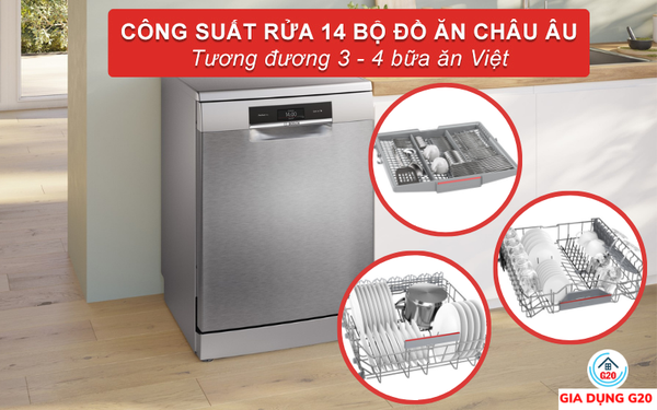 Dung tích rửa của máy rửa chén Bosch SMS8TCI01E lên đến 14 bộ đồ ăn châu Âu. Công suất này tương đương với 3-4 bữa ăn của gia đình 4-6 người Việt.