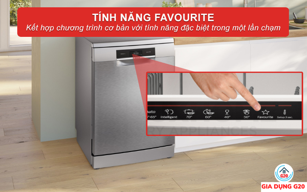 Ngoài ra, Favourite còn cho phép người dùng kết hợp các chương trình rửa cơ bản khác với tính năng đặc biệt giúp người dùng thao tác chỉ với 1 nút nhấn duy nhất. Tiện lợi hơn là người dùng có thể sử dụng tính năng này thông qua ứng dụng Home Connect trên thiết bị di động.