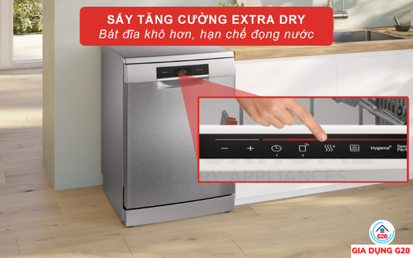Khi kích hoạt thêm chức năng Extra Dry, sau khi quá trình rửa hoàn thành bạn sẽ nhận được sự khô ráo, sạch sẽ dành cho bát đĩa mà tính năng này mang đến. Quá trình này được diễn ra bằng cách nhiệt độ trong khoang sẽ được đẩy lên 70°C vào cuối chu trình rửa và kéo dài 10 phút. Hơi nước còn đọng lại trên bề mặt bát đĩa sẽ bay hơi tối ưu nhất. Thêm vào đó tính năng này còn ngăn ngừa ẩm mốc.