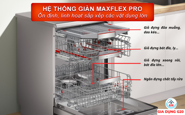 Giàn rửa MaxFlex Pro linh hoạt cùng khớp nối Rackmatic khay điều chỉnh 3 nấc sắp xếp gọn gàng