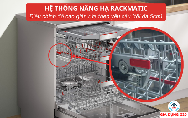 Hệ thống điều chỉnh RackMatic giúp bạn có thể tùy chỉnh không gian trong máy kéo ra vào dễ dàng, nâng hạ lên xuống tới 5cm nhờ RackMatic.