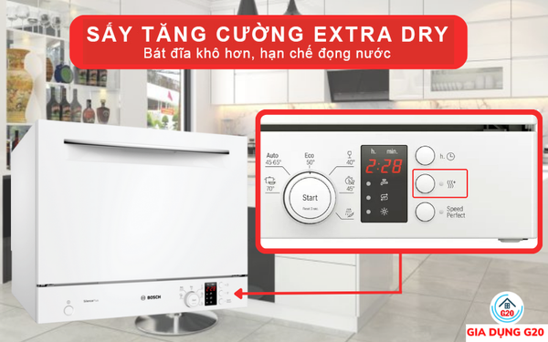 Sấy tăng cường Extra Dry cho bát đĩa khô hơn, hạn chế đọng nước