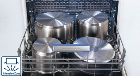 Nếu bạn chọn chức năng Intensive Zone, áp lực nước phun sẽ tăng lên đối với giỏ chứa dưới, nơi chứa bát đĩa bẩn. Trong giỏ phía trên, chu trình rửa không thay đổi và các dụng cụ mỏng manh vẫn sẽ được rửa nhẹ nhàng.