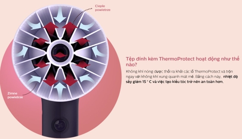 Chế độ sấy bảo vệ tóc (Thermo Protect) cung cấp nhiệt độ sấy khô tối ưu (duy trì ở mức 56 - 58 độ C) và tăng cường bảo vệ tóc không bị quá nóng.
