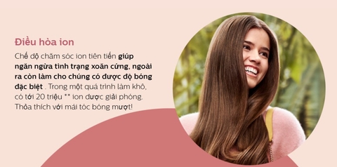 Tạo ra luồng khí với khoảng 20 triệu ion âm thấm sâu vào tóc, loại bỏ hiện tượng tĩnh điện, chăm sóc tóc và ép phẳng các biểu bì tóc mang lại mái tóc bóng mượt và không bị xoăn rối.