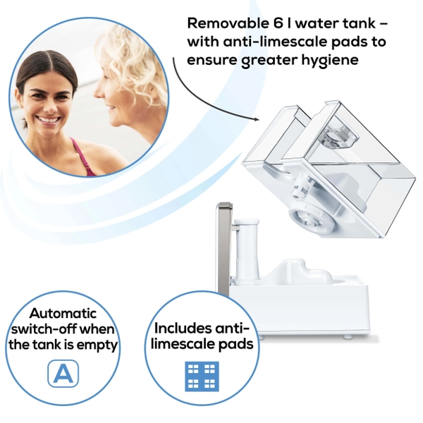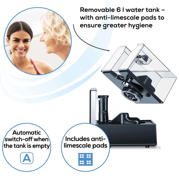 - Với dung tích bình chứa 6 lít, công suất phun hơi lên đến 550 ml/h dùng được trong thời gian dài. Hơn nữa, bình chứa của máy tạo ẩm Beurer còn có thể dễ dàng tháo rời, tạo điều kiện thuận lợi cho bạn có thể dễ dàng vệ sinh máy mỗi khi cần.