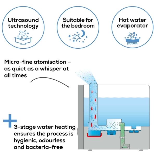 - Công nghệ kép: Máy phun sương siêu âm với hơi nước