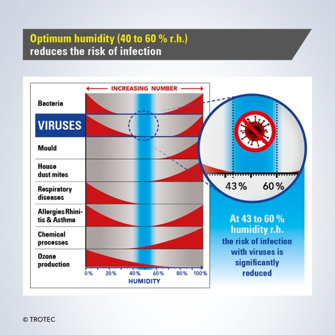 Các chuyên gia nhấn mạnh rằng chúng ta có thể giảm nguy cơ nhiễm bệnh bằng cách tăng độ ẩm trong các tòa nhà. Tăng độ ẩm không khí bằng cách tạo ẩm lên khoảng 50% dẫn đến giảm nguy cơ lây truyền bệnh. Ngoài ra, không khí được làm ẩm giúp cải thiện khả năng phòng vệ của cơ thể bằng cách làm sạch đường hô hấp hiệu quả hơn và tăng cường hệ miễn dịch. Trong các tòa nhà hiện đại với vỏ tòa nhà kín, hệ thống sưởi và thông gió trung tâm, các giá trị giới hạn này thường không thể đáp ứng được trong cuộc sống hàng ngày nếu không có hệ thống làm ẩm không khí chủ động. Tuy nhiên, một thiết bị có chức năng làm ẩm không khí có thể giúp ích ở đây.