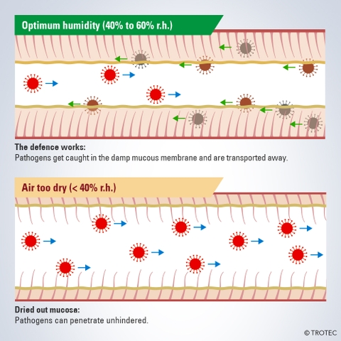 Cơ thể không có khả năng tự vệ trước sự nguy hiểm của vi rút và vi khuẩn. Nó có cơ chế phòng thủ riêng để bảo vệ mình khỏi các mầm bệnh trong không khí. Các màng nhầy của miệng, mũi và họng của đường hô hấp là thành phần trung tâm của hệ thống miễn dịch của cơ thể và khi được làm ẩm tối ưu sẽ đảm bảo khả năng bảo vệ hiệu quả chống lại các mầm bệnh trong không khí. Mặt khác, không khí trong phòng quá khô sẽ lấy đi lượng nước cần thiết từ lớp chất nhầy, do đó, lớp chất nhầy bảo vệ trước đó trở nên cứng và các mầm bệnh truyền nhiễm có thể xâm nhập vào cơ thể mà hầu như không bị cản trở.