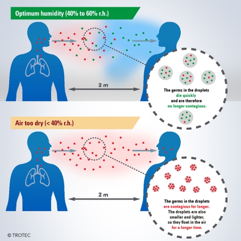 Các chuyên gia đã đánh giá kết quả nghiên cứu về khả năng kháng vi rút (ví dụ như SARS-CoV, MERS-CoV hoặc SARS-CoV-2 (Covid-19), cúm) và độ ẩm. Nó chỉ ra rằng độ ẩm không khí có ảnh hưởng nghiêm trọng đến sự lây nhiễm của các giọt vi trùng. Không khí trong phòng khô với độ ẩm tương đối dưới 40% cho phép các hạt nhỏ bị nhiễm vi rút cúm hoặc cảm lạnh khô lại. Do đó, mầm bệnh được bảo tồn và có khả năng lây nhiễm trong một thời gian rất dài. Trong phạm vi tối ưu của độ ẩm tương đối từ 40 đến 60%, sol khí chỉ co lại đến mức nồng độ muối trong lõi sol khí tăng lên, do đó vi trùng và vi sinh vật chứa trong đó bị tiêu diệt. Nguy cơ lây nhiễm vi rút cúm và cảm lạnh được giảm thiểu ở đây.