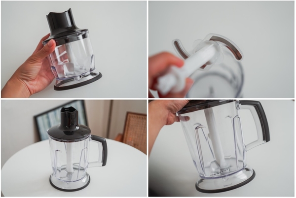 - Bật thiết bị để khởi động máy xay. Trong quá trình chế biến, giữ phần động cơ bằng một tay và cối xay bằng tay còn lại.