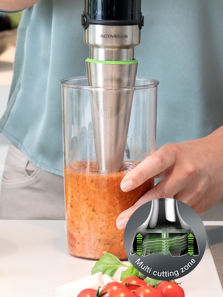 ActiveBlade độc đáo di chuyển lên và xuống để dễ dàng xay trộn tất cả các loại thực phẩm nhờ bề mặt cắt hoạt động nhiều hơn 250% (so với máy xay cầm tay Braun có trục không ActiveBlade) để làm việc - một người trợ giúp nhà bếp thông minh để bạn có thể hoàn thành công việc một cách dễ dàng.