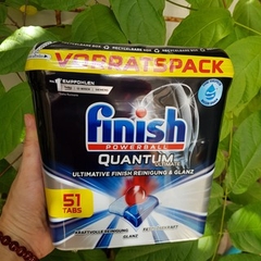 Túi viên rửa bát Finish Quantum 51 viên là dòng cao cấp và đắt tiền của Finish vì tổng hợp cả 3 thành phần: Làm sạch mỡ + Chống cặn bám+ Chất làm bóng đồ sứ và thuỷ tinh trong 1 viên rửa.
