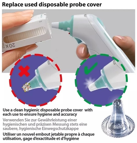 + Braun ThermoScan sẽ không hoạt động cho đến khi khi một nắp bảo vệ đầu dò được lắp.