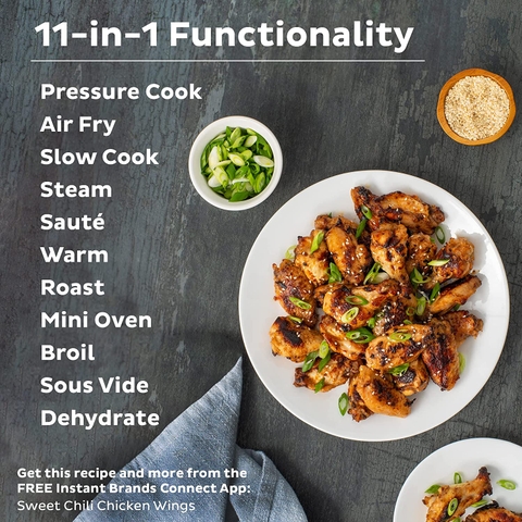 11 chương trình nấu ăn thông minh được cài đặt sẵn cho chiên không dầu, nấu áp suất, súp, đậu, cơm, gia cầm, sữa chua, tráng miệng và hơn thế nữa.