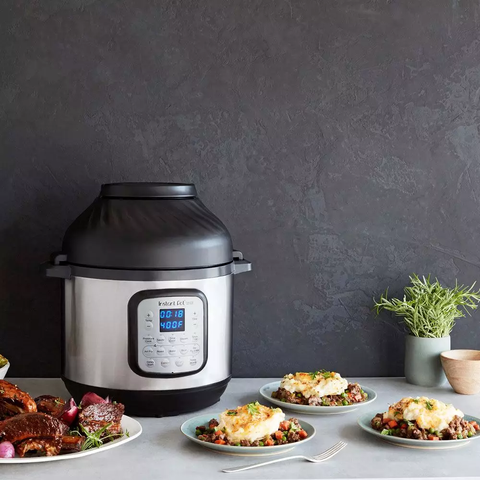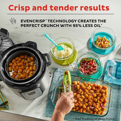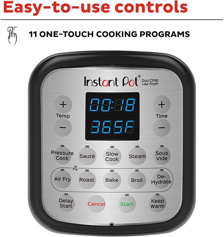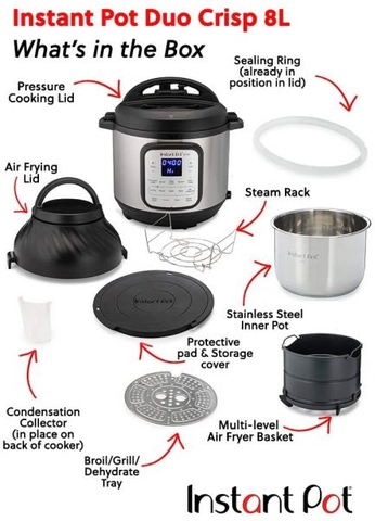 Nồi áp suất kiêm chiên không dầu Instant Pot Duo Crisp 8Qt 11-in-1 Tích hợp 11 chức năng trong chiếc nồi: Chiên không dầu, nướng, nướng bánh, nướng bề mặt nhiệt cao, sấy khô, nấu áp suất, nấu chậm, hấp, chảo xào, giữ ấm, sous vide.