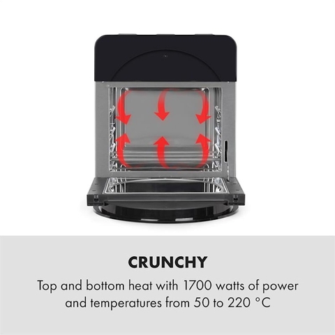Bí mật của nồi chiên không dầu Klarstein AeroVital Easy Touch 14L Metallic là hệ thống làm nóng 1700 watt của nó, chiên chín ròn đều khoai tây chiên, bánh hoặc thịt nướng với đỉnh và đáy phủ đều nhiệt từ Công nghệ Dual Heating.